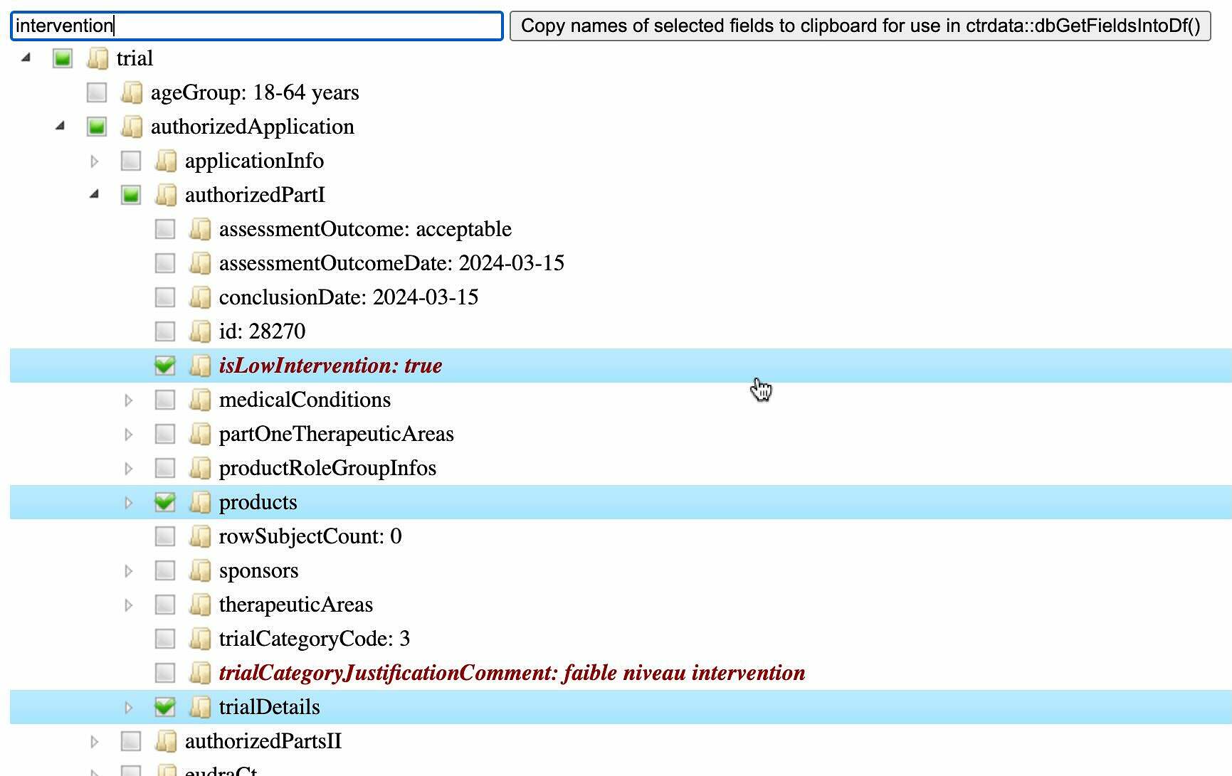 To explore the structure, field names and values of a single trial from one of the registers, use function ctrShowOneTrial() in package ctrdata and this post, which provides and interactive widget such as below. To find any fields of interest in all trials in the database collection, use dbFindFields().